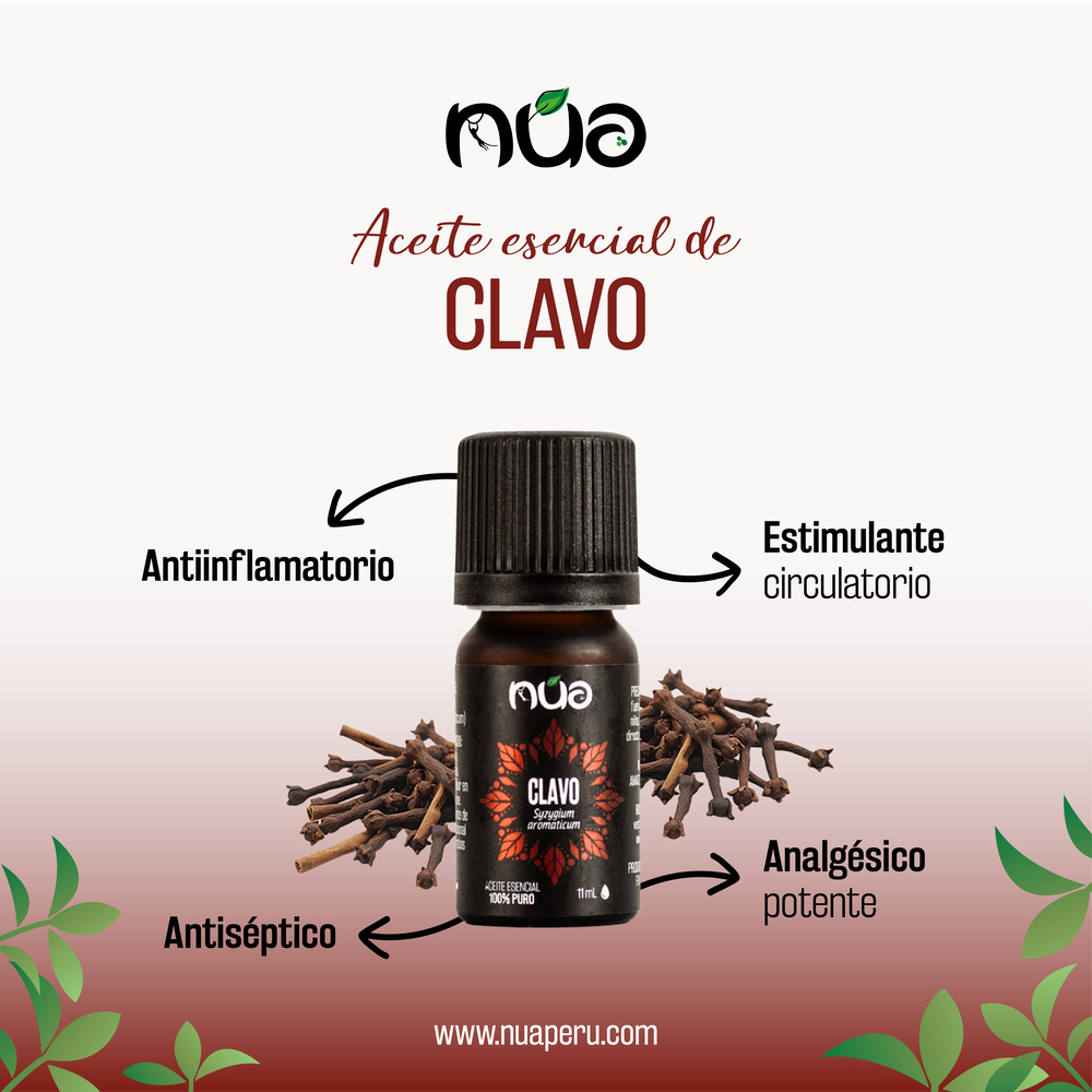El clavo (Syzygium aromaticum) se ha utilizado desde la antigüedad por sus propiedades analgésicas, antisépticas, antivirales, antimicóticas, estimulantes y afrodisíacas. Es efectivo en el tratamiento de molestias bucales. Su aroma es relajante, calma el estrés, y la irritabilidad. Aplicado en masajes o frotaciones mejora la digestión y alivia la jaqueca.