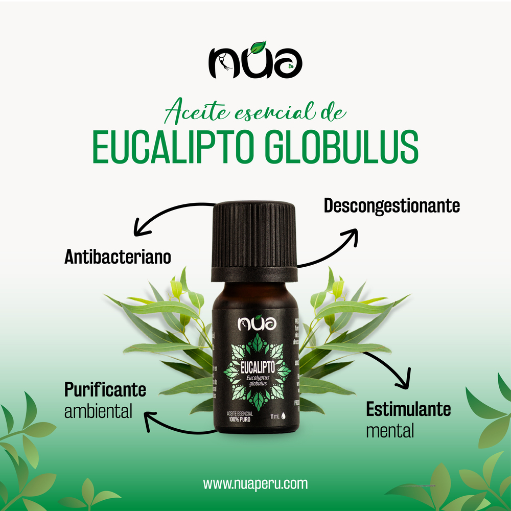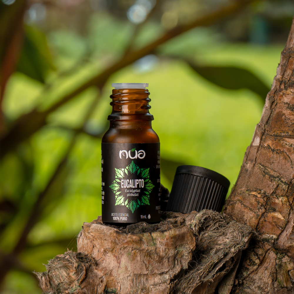 El aceite esencial de eucalipto (Eucalyptus globulus) se destaca por sus potentes efectos descongestionantes, antisépticos y antiinflamatorios. Debido a su composición rica en eucaliptol (1,8-cineol), es un poderoso expectorante. Facilita la expulsión de mucosidad y mejora la respiración. Su acción antimicrobiana ayuda a combatir infecciones bacterianas y fúngicas. Además, su aroma fresco y penetrante estimula la mente y reduce la fatiga.