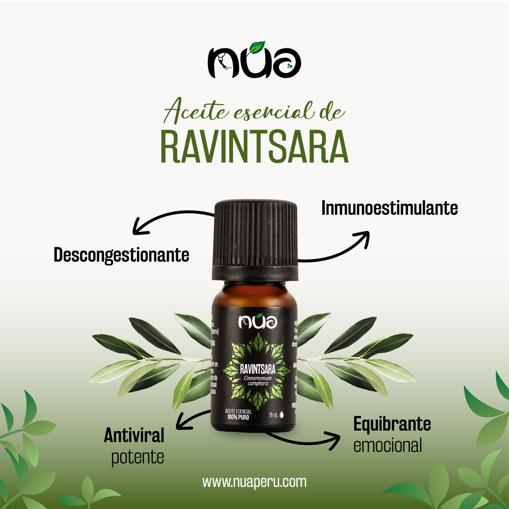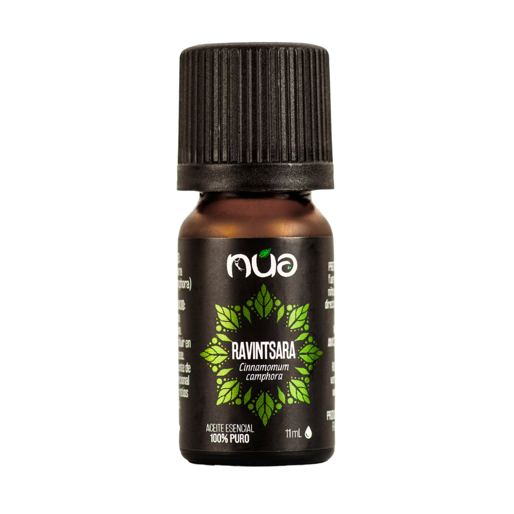 El aceite esencial de Ravintsara (Cinnamomum camphora) proviene de un árbol de la familia de las Lauráceas, conocido como alcanforero, originario de Japón y transportado por los colonizadores a Madagascar, hace varios siglos. Recomendado para prevenir y curar problemas respiratorios como resfriados, bronquitis, gripes. Tiene propiedades antisépticas y antivirales. Fortalece el sistema inmunológico y es un aliado contra diferentes virus y bacterias. Durante mucho tiempo se confundió con el aceite esencial de Ravensara (Ravensara aromatica), árbol oriundo de Madagascar, de la misma familia, cuya composición bioquímica es diferente.