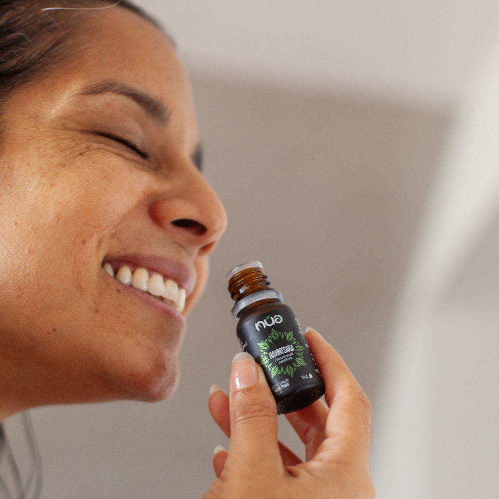 - Fatiga o estrés crónico: automasajes con 1 gota de aceite esencial de ravintsara en 1 cucharadita de aceite de coco, almendras, jojoba u otro.