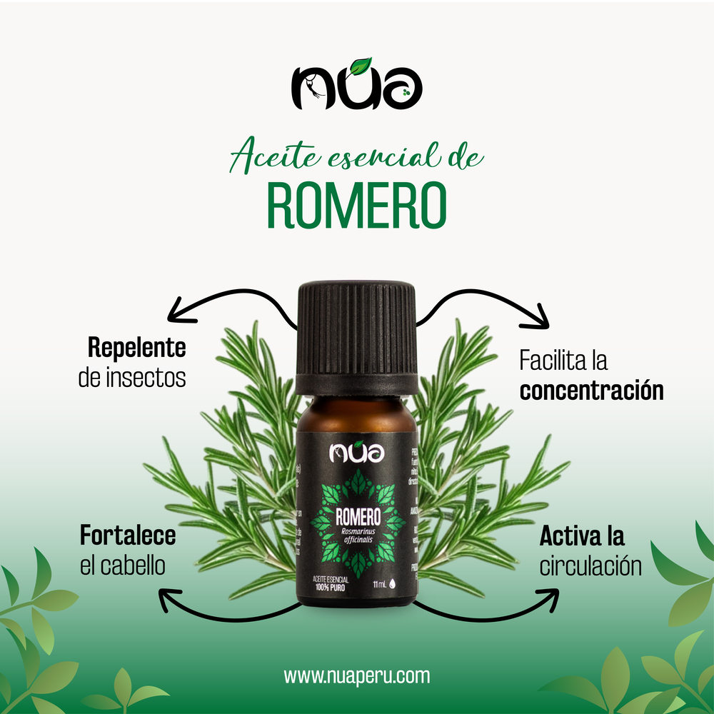 El Romero (Rosmarinus officinalis) tiene un aroma fresco, herbáceo, dulce y ligeramente medicinal. Es un aceite energizante, puede ser beneficioso para ayudar a restaurar el estado de alerta mental cuando se experimenta fatiga. También es un ingrediente popular en productos para el cuidado de la piel y el cabello. Este aceite debe diluirse antes de su uso y se recomienda solo para adultos.