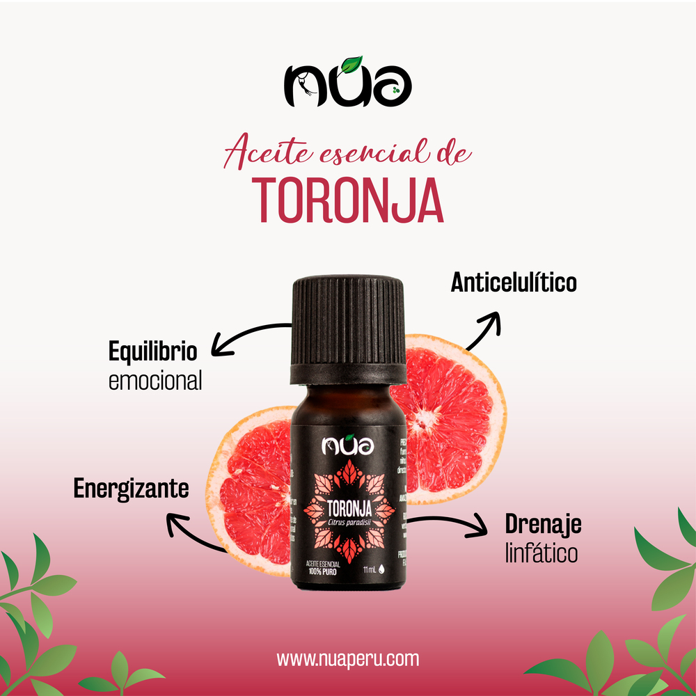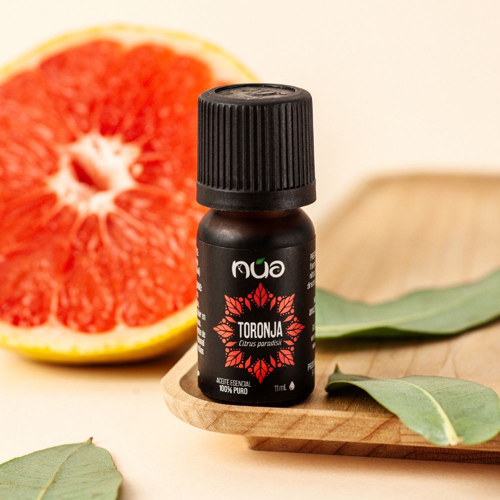 La toronja (Citrus paradisi) tiene un aroma dulce, fresco y cítrico que promueve la tranquilidad, el optimismo y el buen humor. Es antiséptico, astringente, diurético y digestivo. Rico en el poderoso antioxidante d-limoneno. Mejora la salud de la piel en casos de exceso de grasa, acné, psoriasis y celulitis.