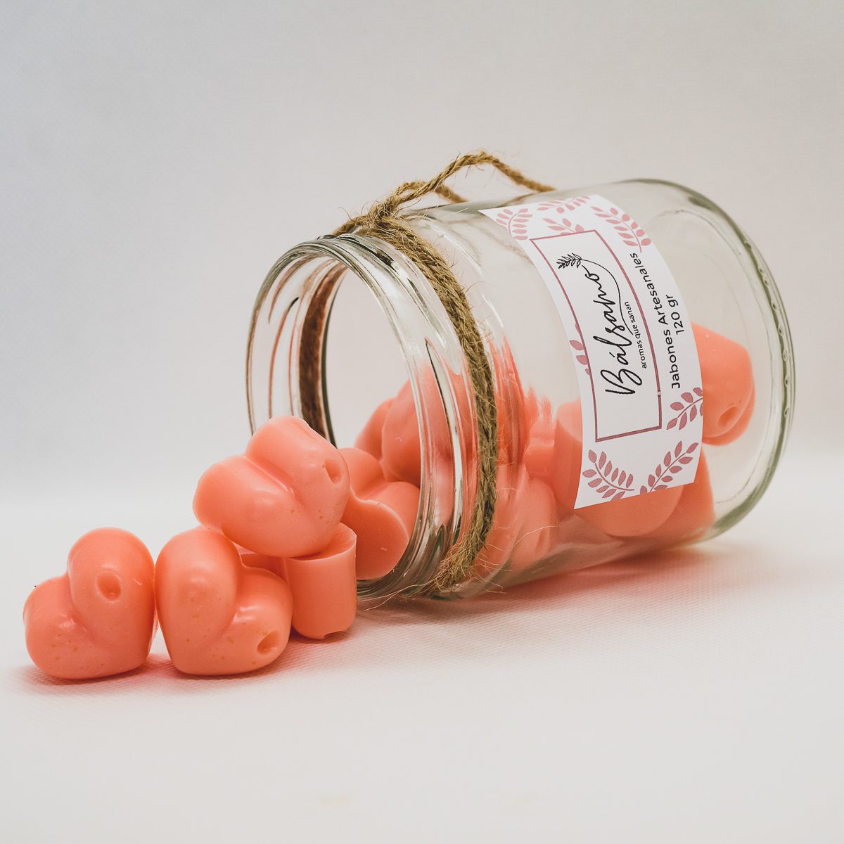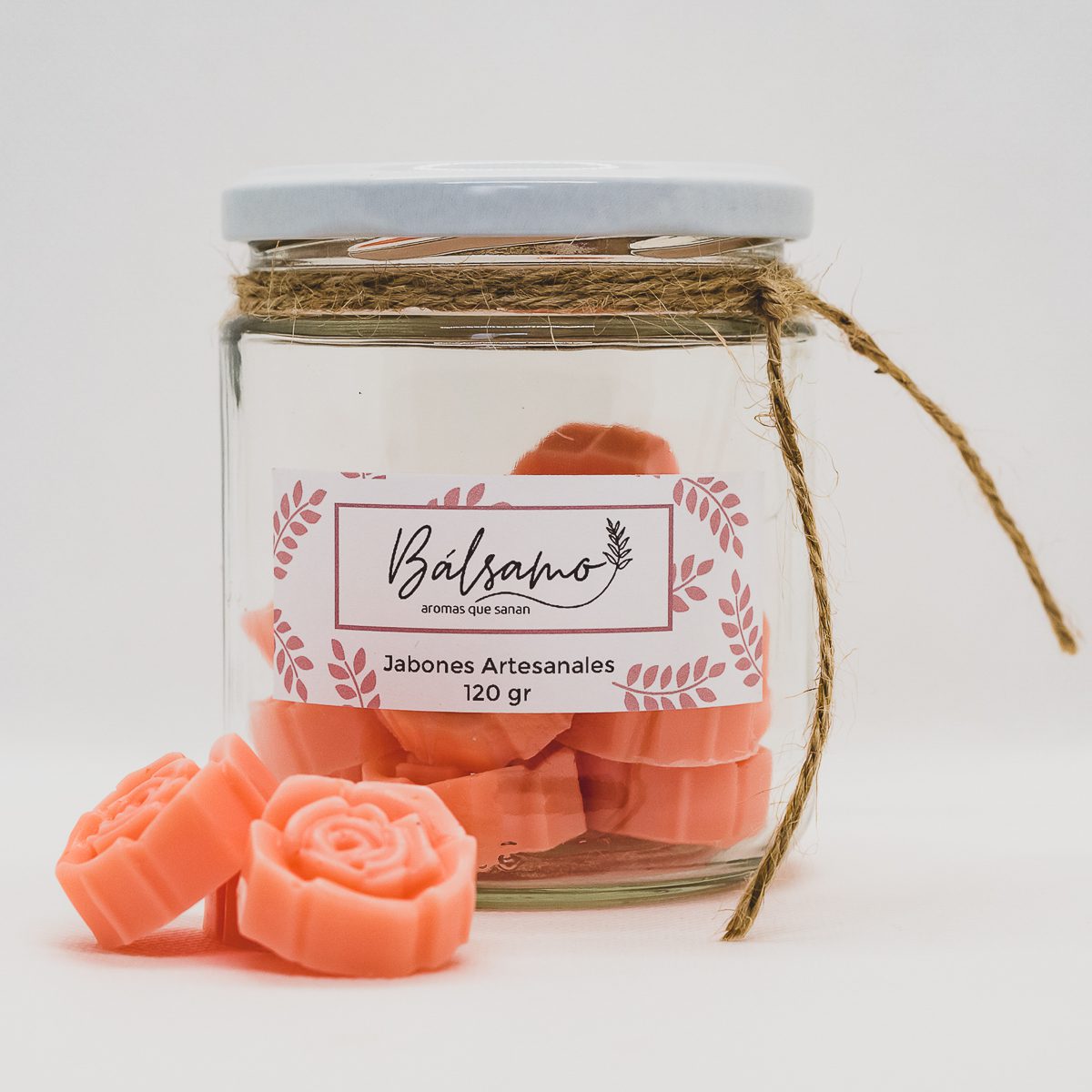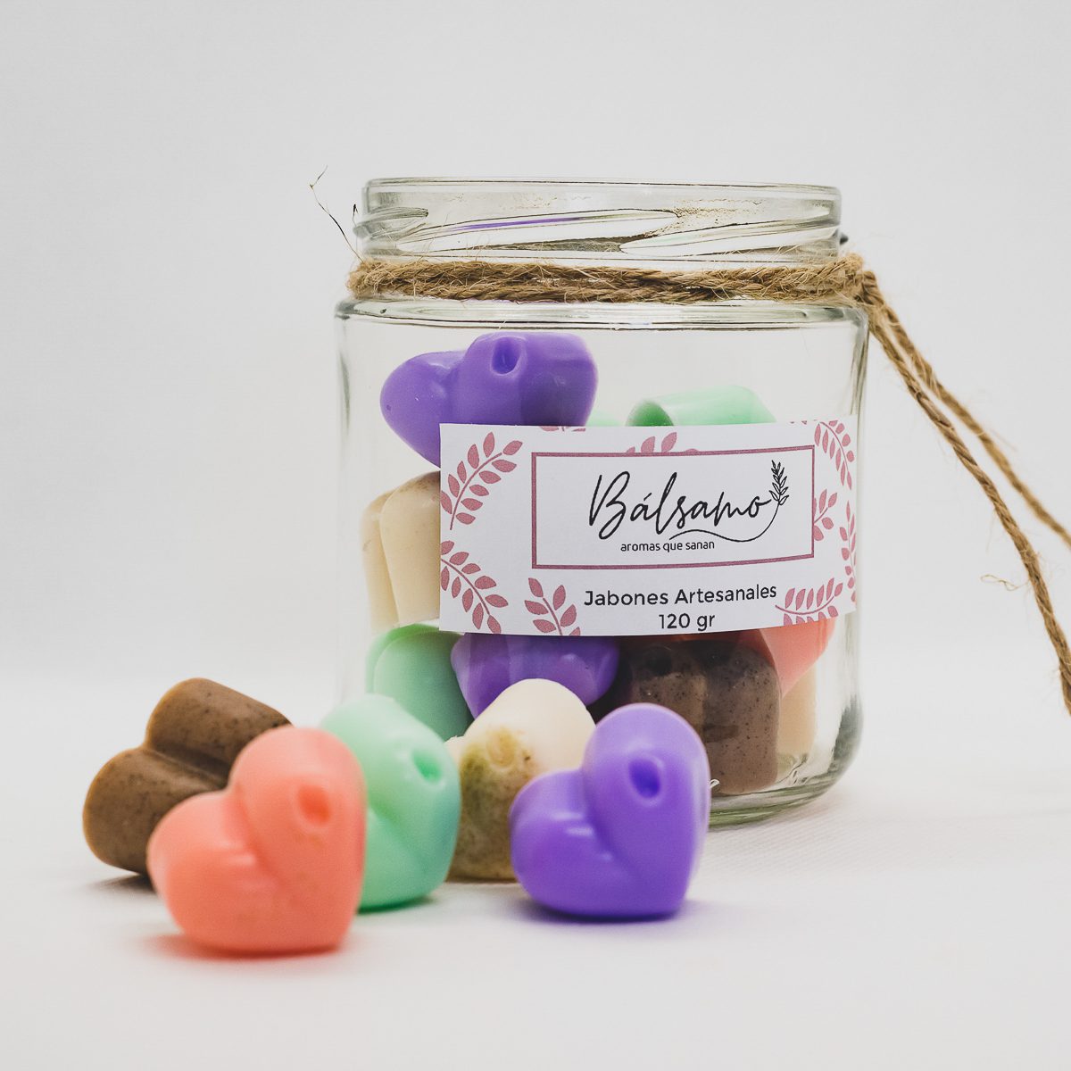 Mini jabones elaborados con glicerina 100% vegetal y empacados en frasco de vidrio reciclable. Cada frasco contiene 15 mini jabones (peso total aprox. 120 Gr.)