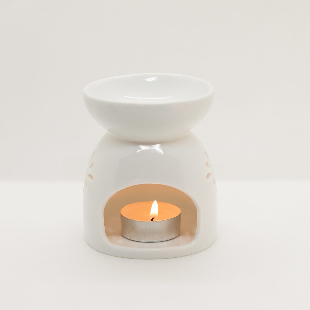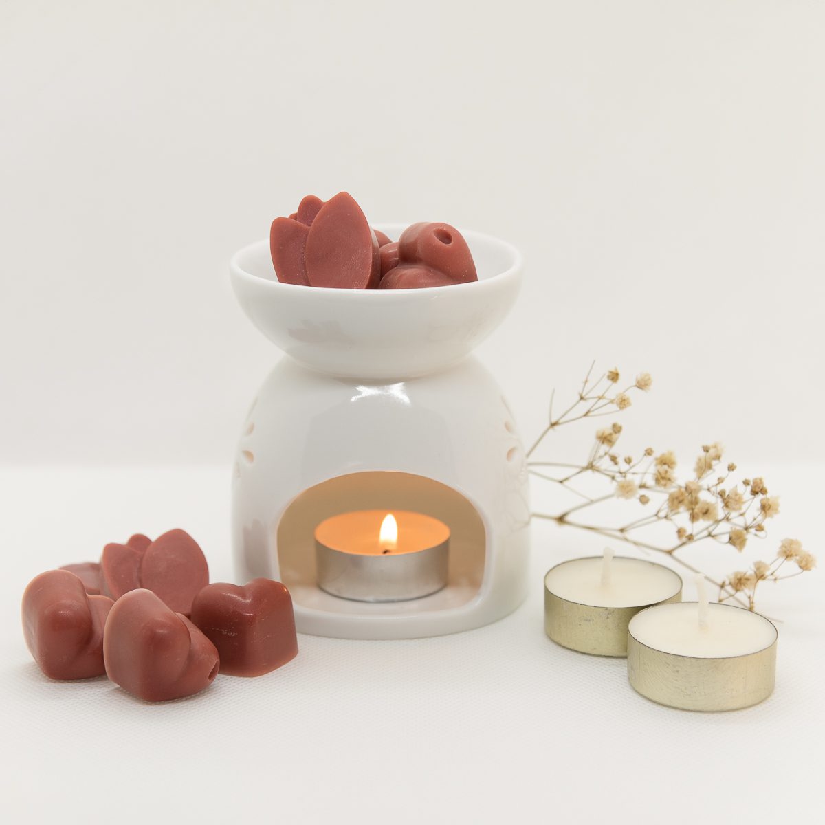 El pack incluye una bolsa con 40 g wax melts, un hornito quemador hecho de cerámica y tres tea light.